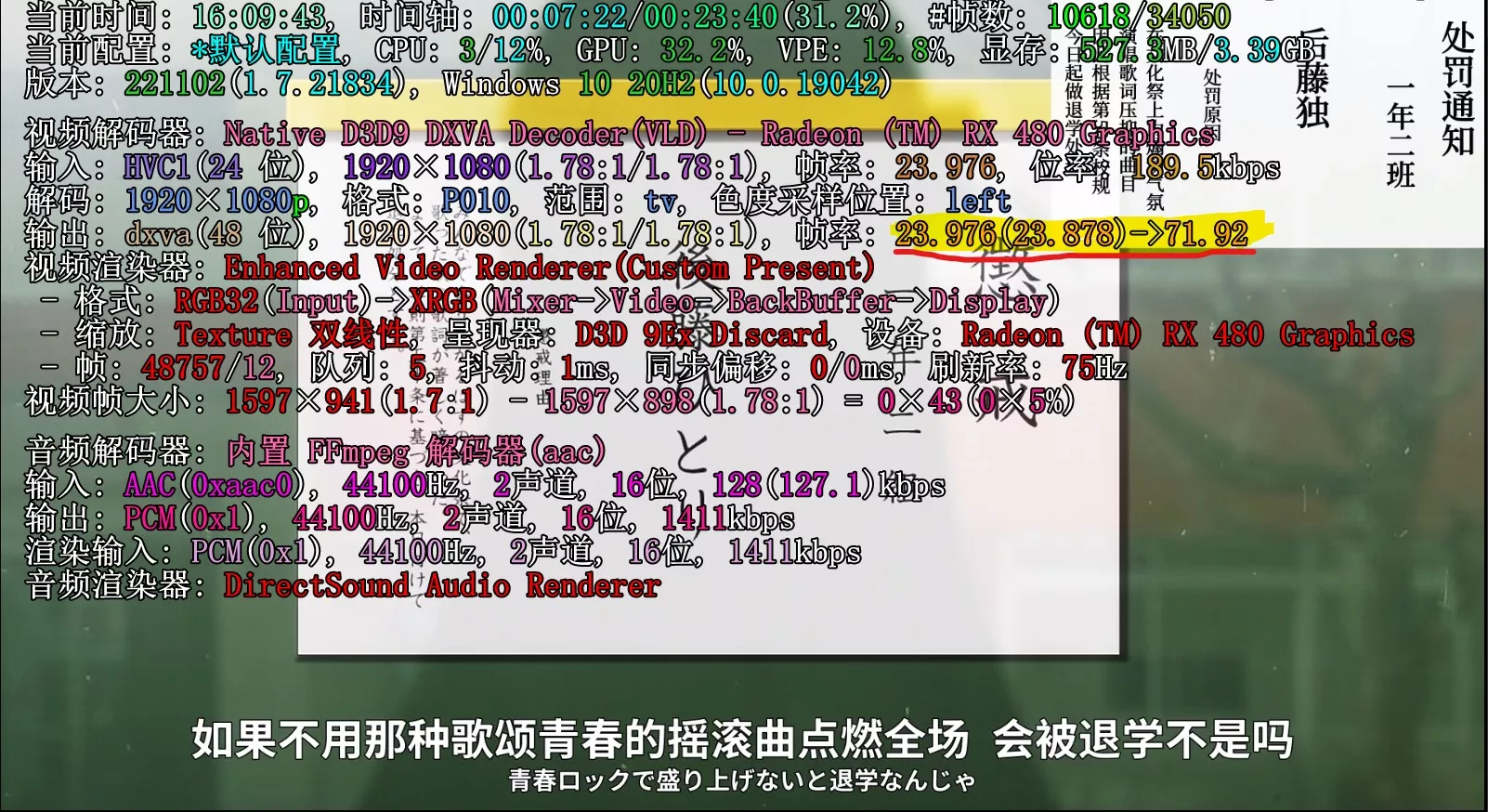 可以看到帧率显示“23.976 -> 71.92”,这就代表插帧成功了