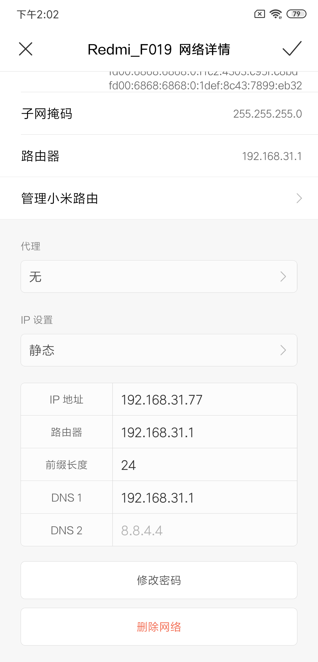 在手机中WLAN设置中,将IP分配方式设置为静态,记住这一IP