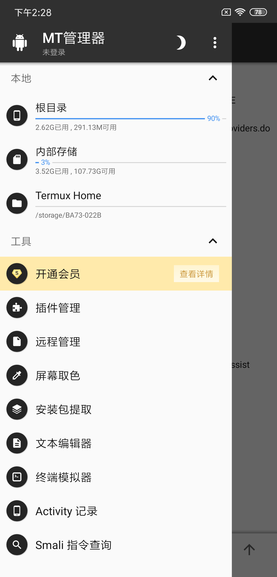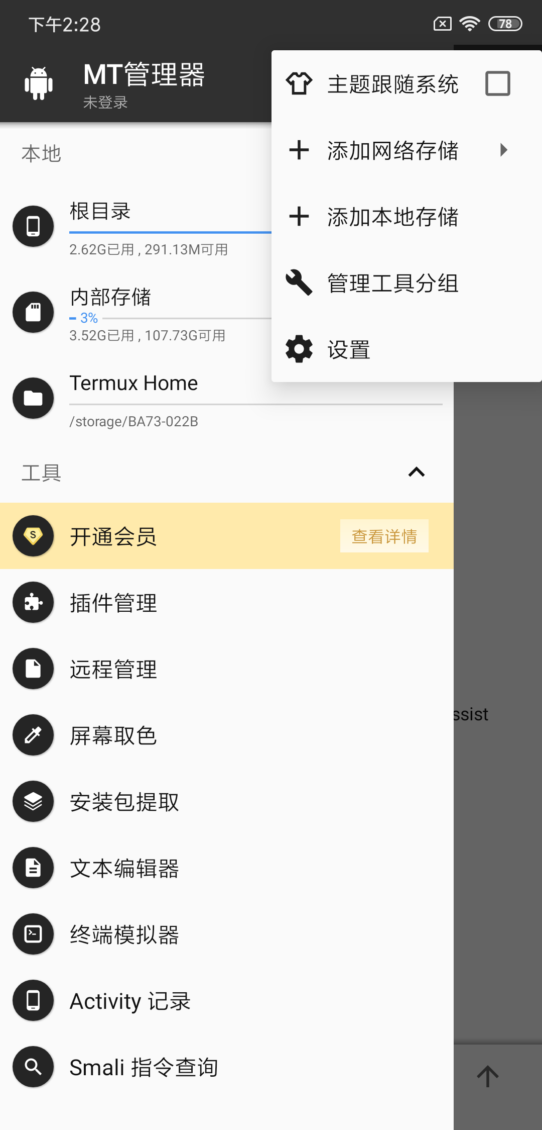 安装并打开MT管理器,按要求授权后点击左上角,再点击菜单右上角的三个点添加本地储存,选择Termux即可