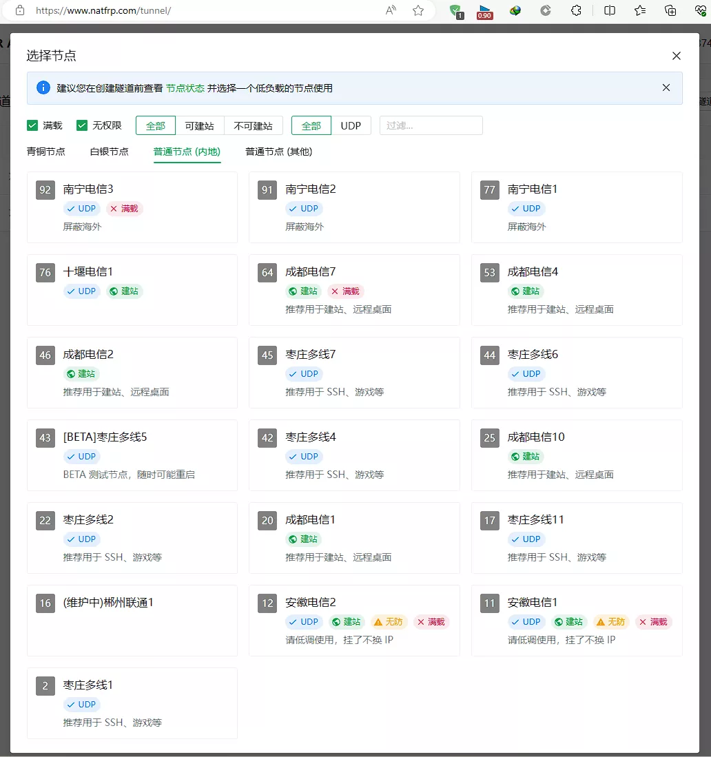 服务-隧道列表创建隧道,在普通节点中选择一个合适的节点