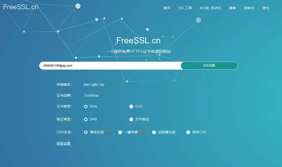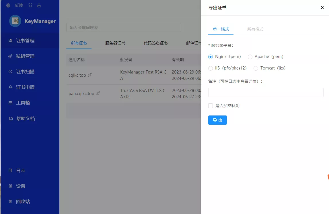 如图选择即可,CSR选择离线生成,用他提供的KeyManager软件导出Nginx格式的证书(包含.key和.crt两个格式的文件)
